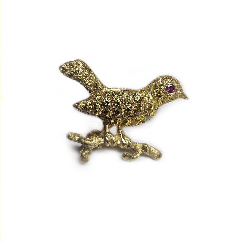 CanarySmall 18ct yellow gold canary bird sitting on a tiny branch, fully encrusted with brilliant-cut intense yellow diamonds and a brilliant-cut red ruby eye.
