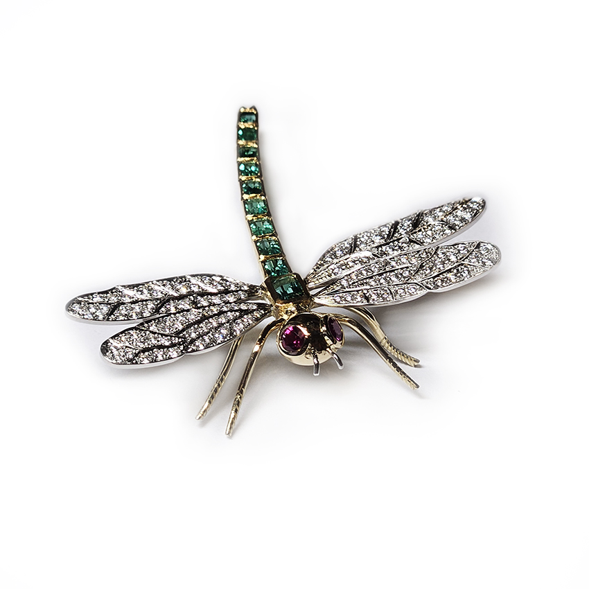 ![]() DragonflyThe A.C. 'Dragonfly' brooch is one of our largest, most stunning brooches which features stunning, Colombian emeralds which form the majestic tail, red rubies for the eyes and diamond-encrusted platinum wings (pave-set) which are connected to a highly polished 18ct yellow gold body.